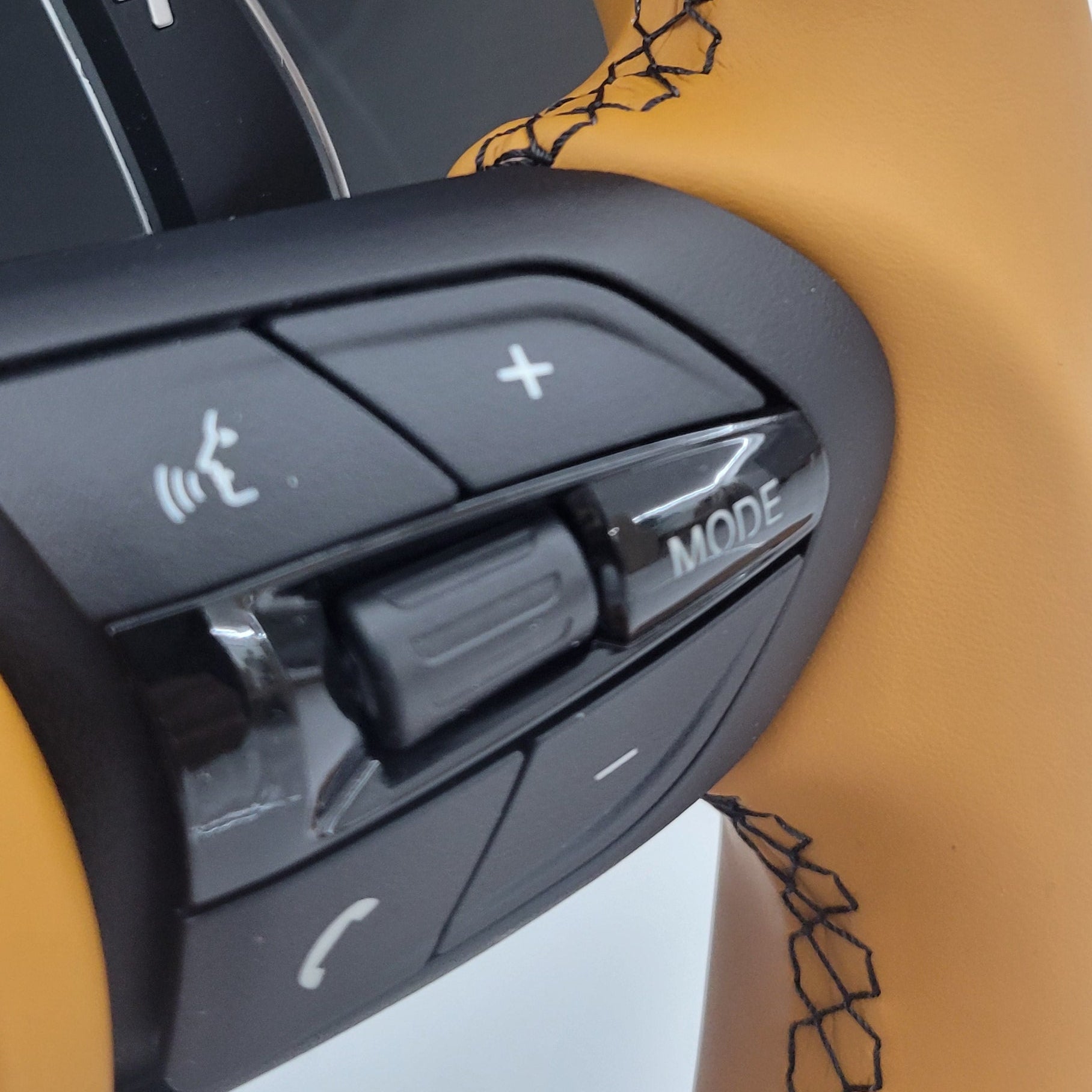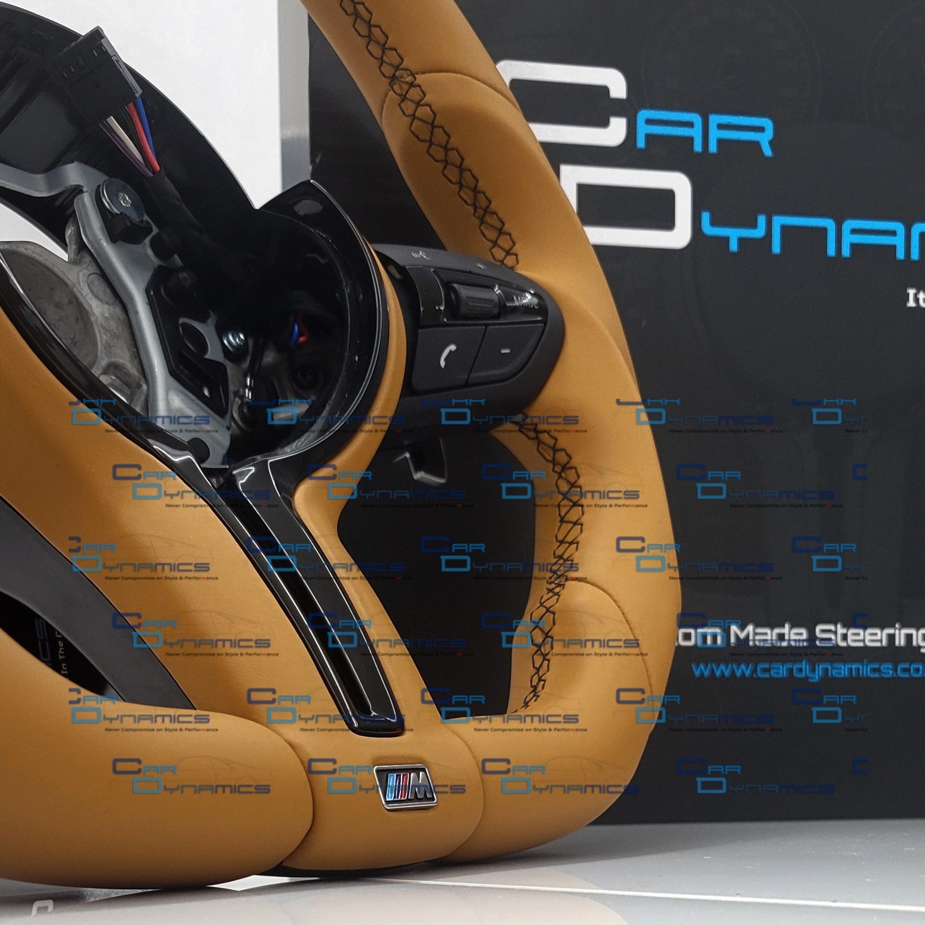 Premium Sports Steering Wheel UpgradeA sleek, performance-focused upgrade for your BMW F-Series, featuring gloss black accents, black stitching and integrated M Tech paddle shifters.