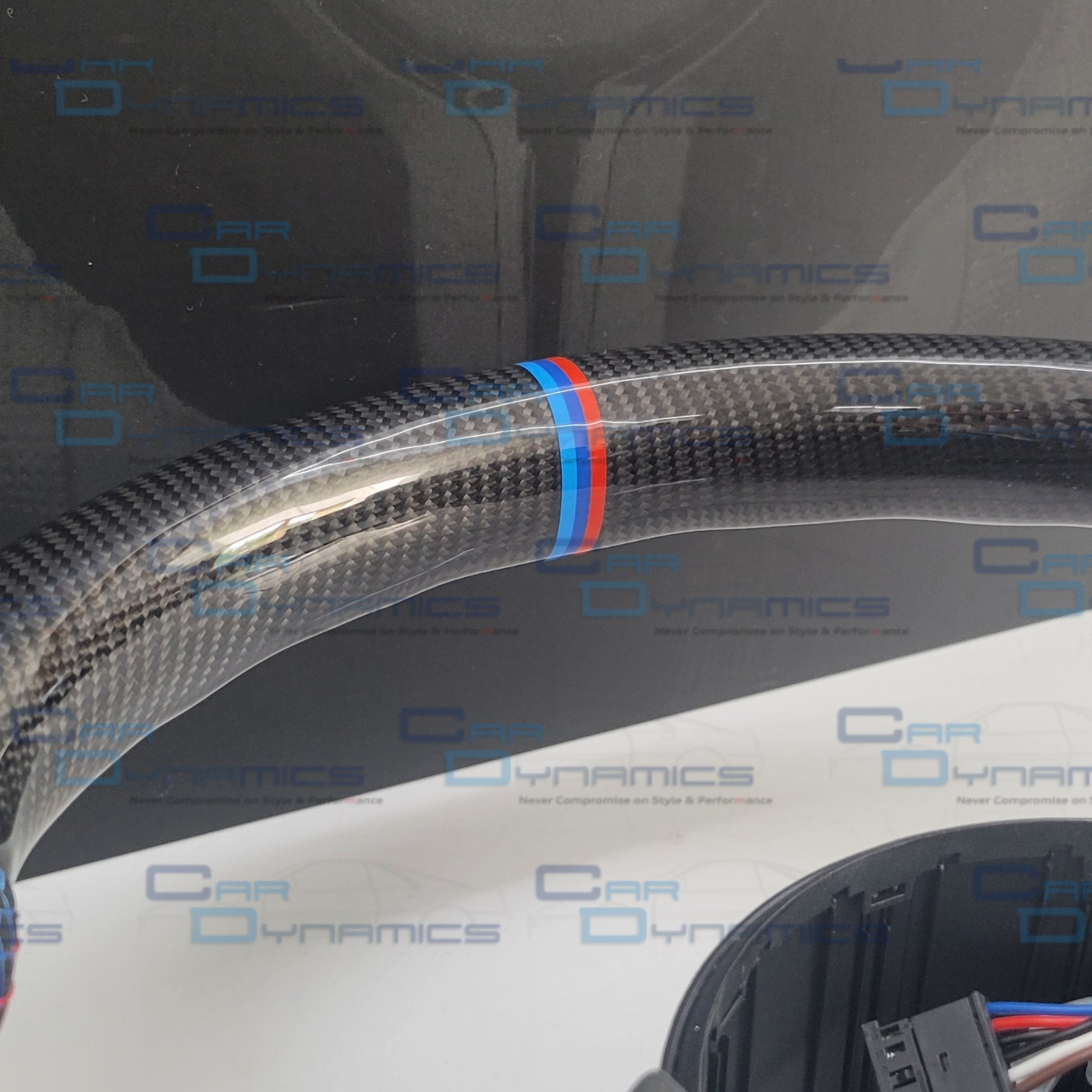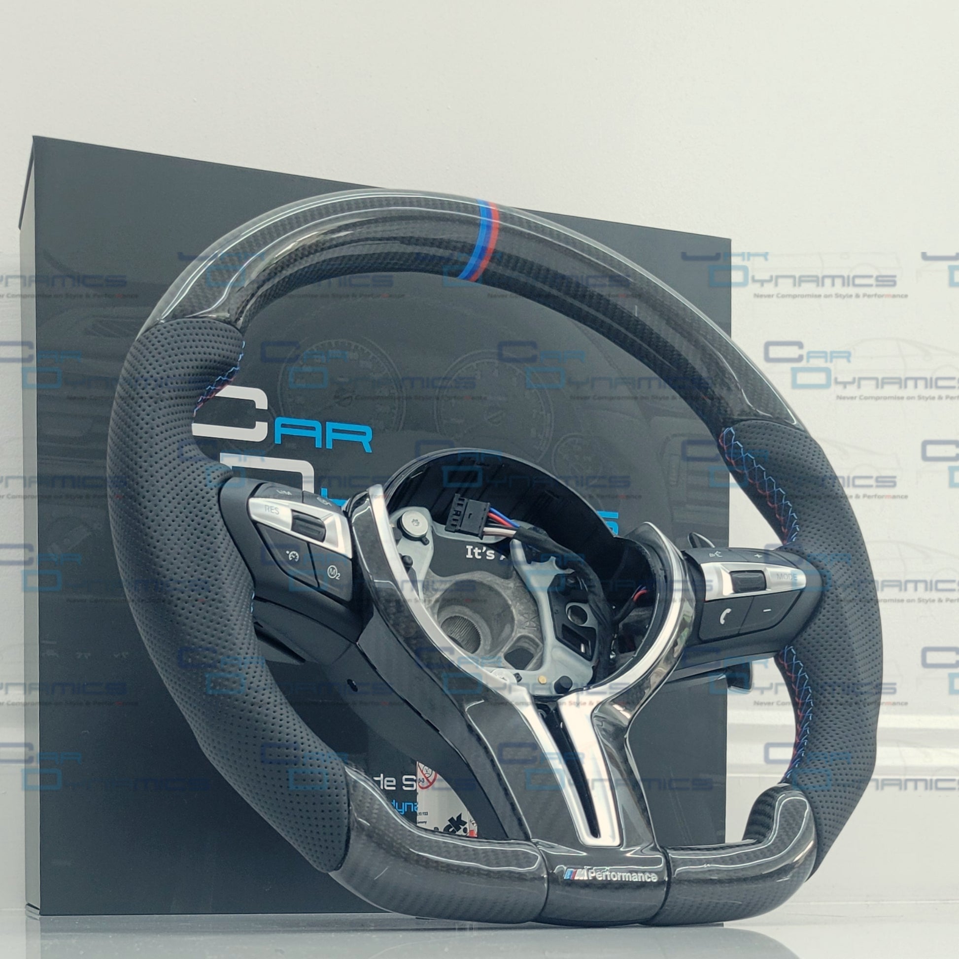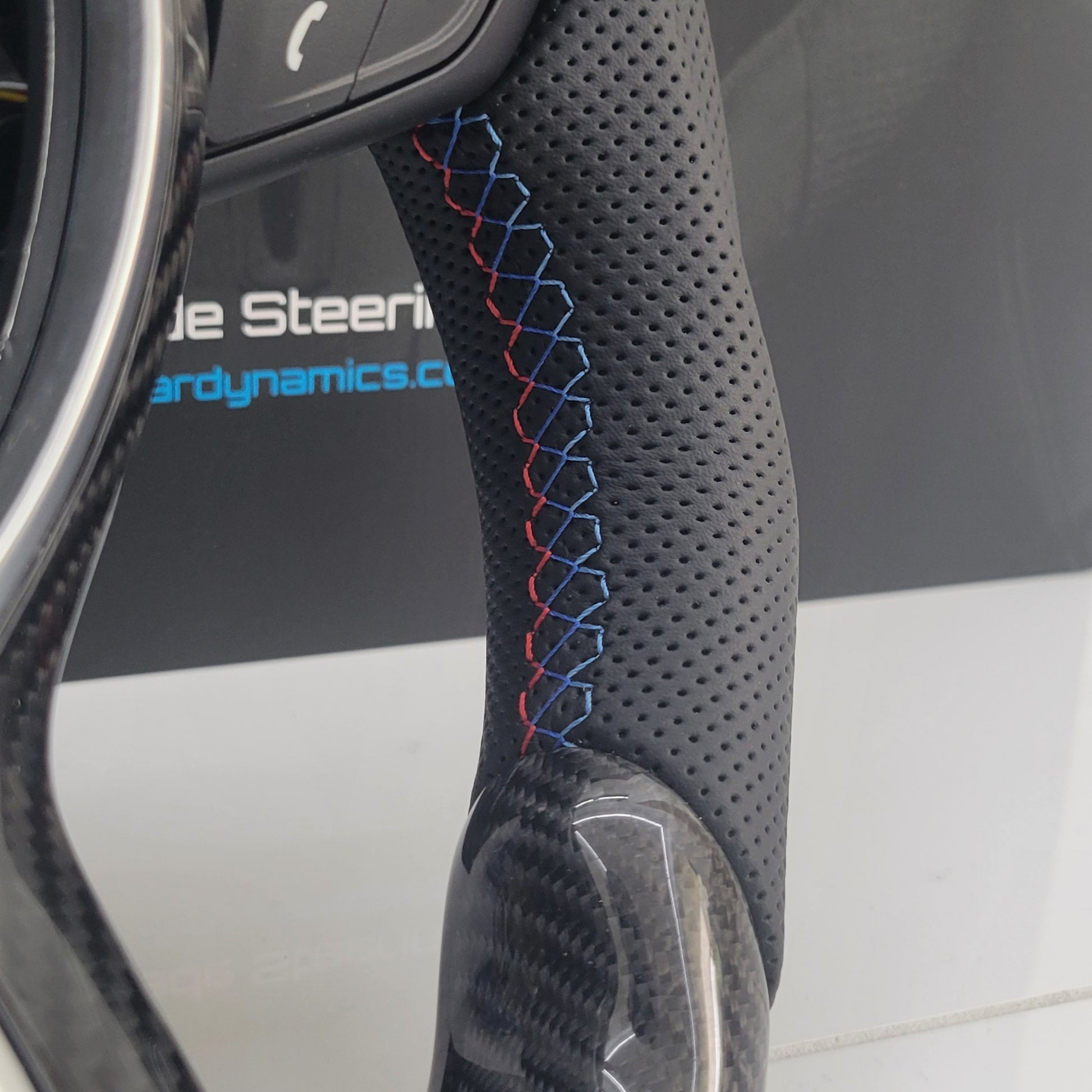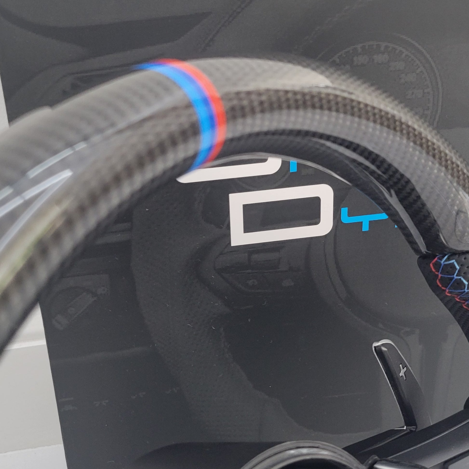 High-Performance Custom Steering WheelPrecision-crafted with forged carbon fibre accents, perforated leather grip, M-Tech stitching, and built-in paddle shifters — engineered for driving enthusiasts.