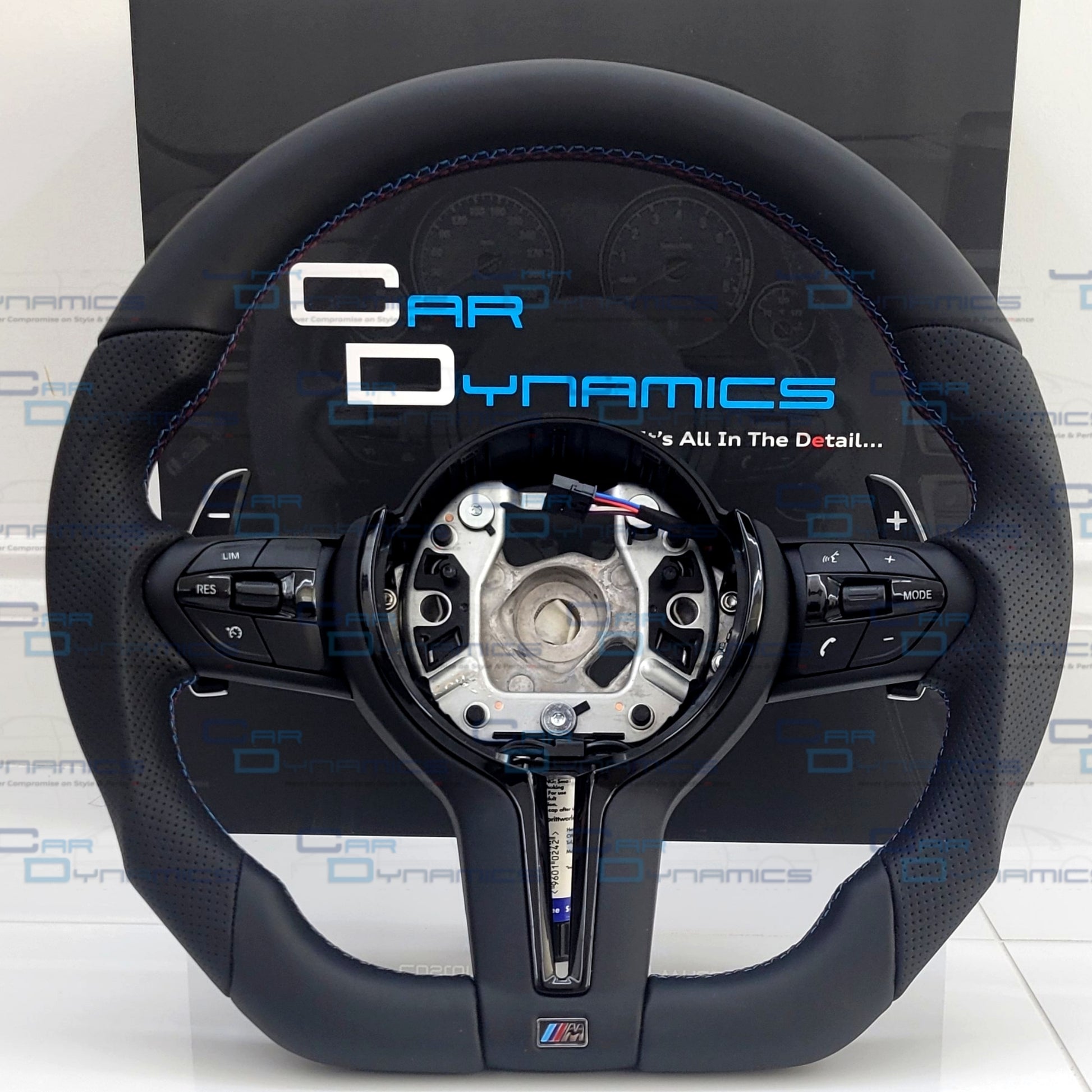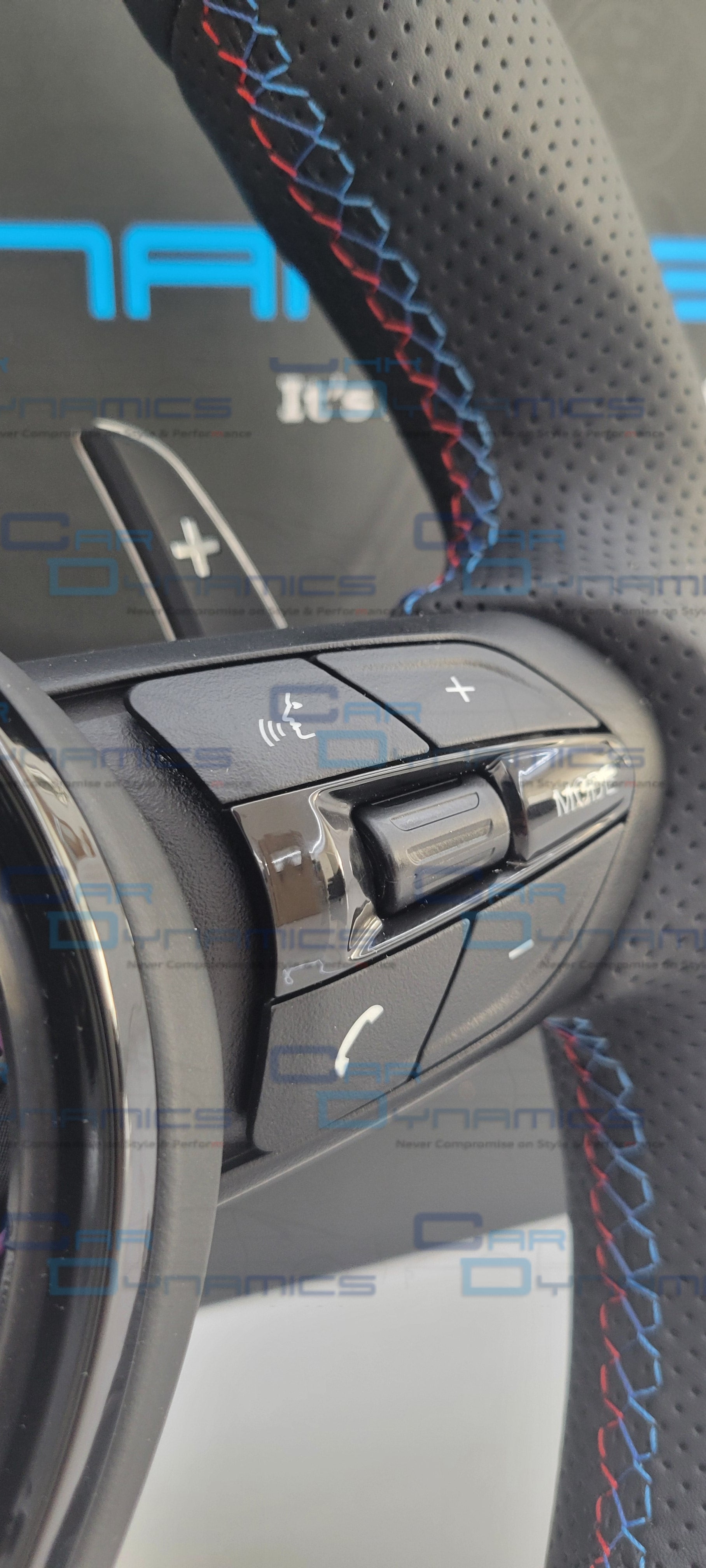 Premium Sports Steering Wheel UpgradeA sleek, performance-focused upgrade for your BMW F-Series, featuring gloss black accents, tri-colour M-Tech stitching, and integrated paddle shifters.