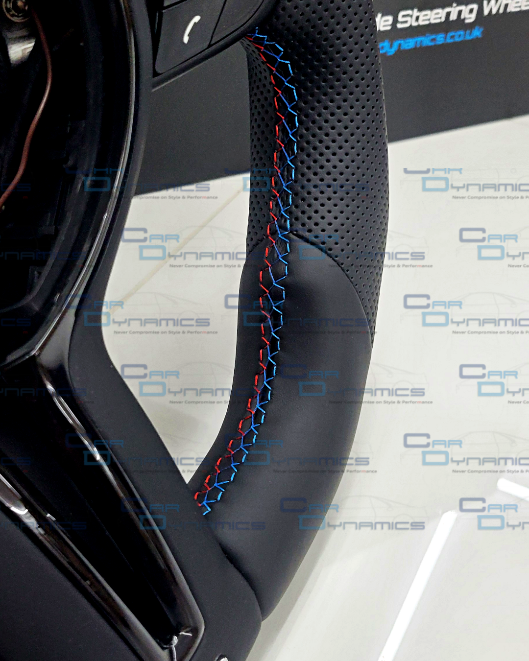 Premium Sports Steering Wheel UpgradeA sleek, performance-focused upgrade for your BMW F-Series, featuring gloss black accents, redline red stitching, and integrated paddle shifters.