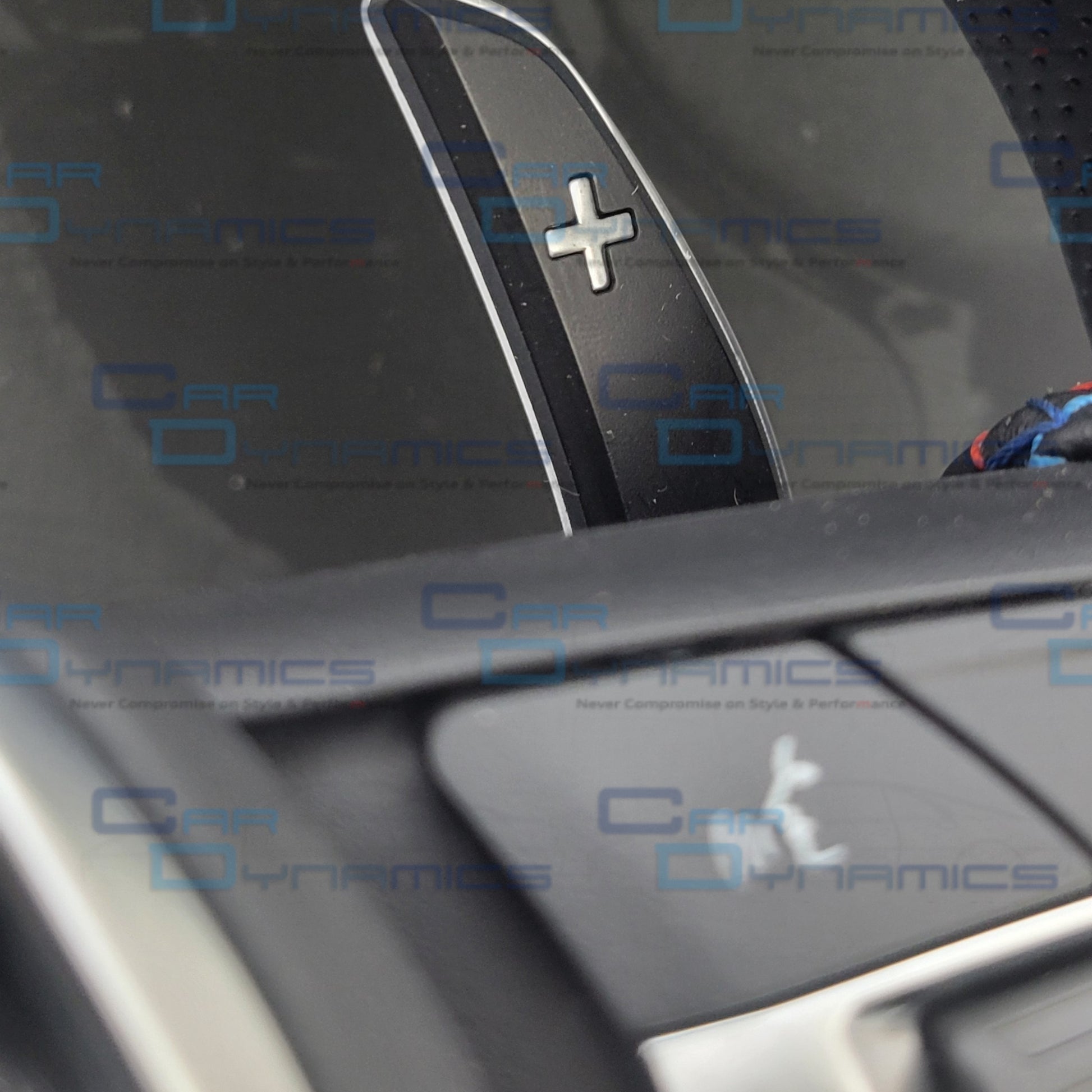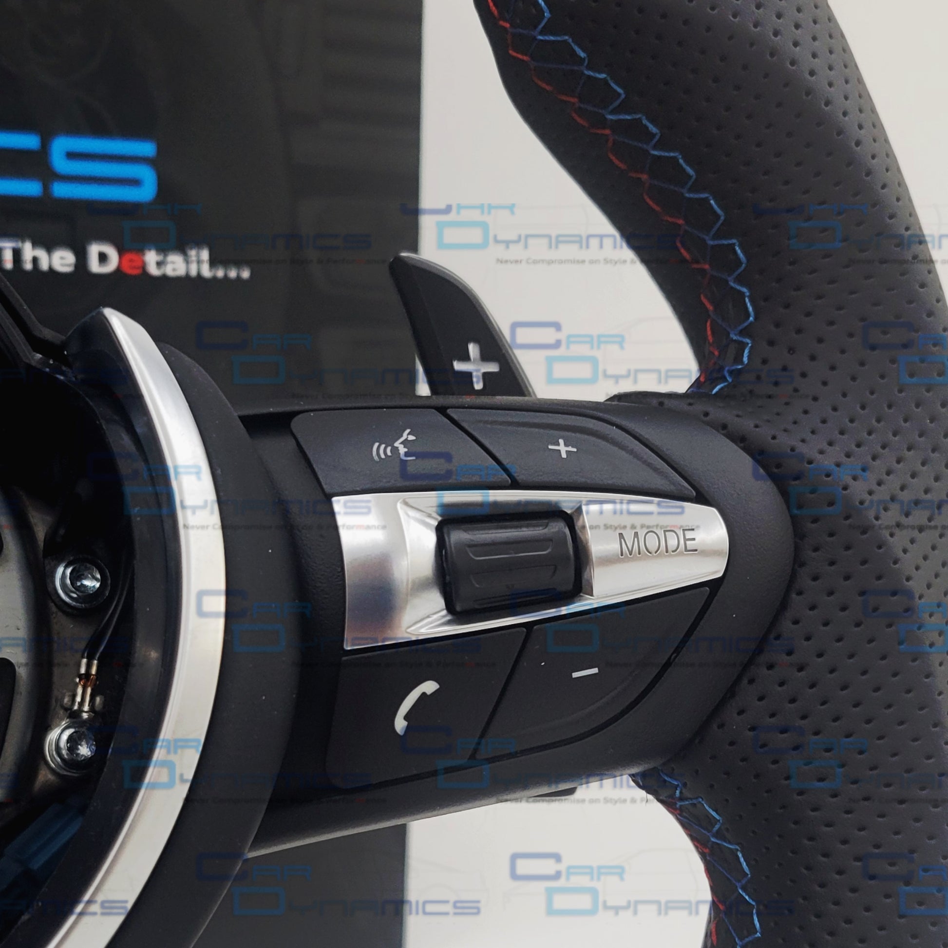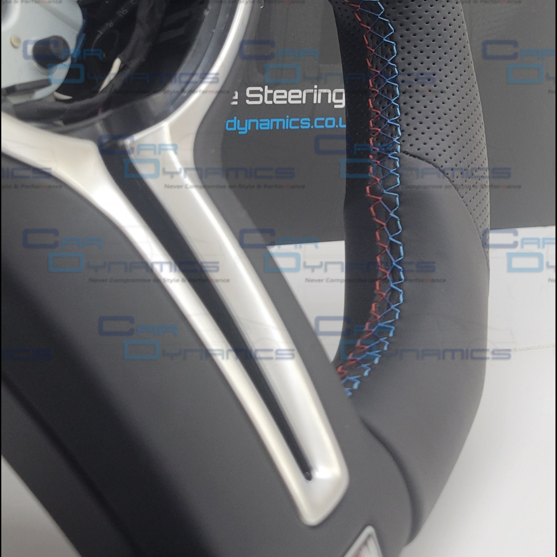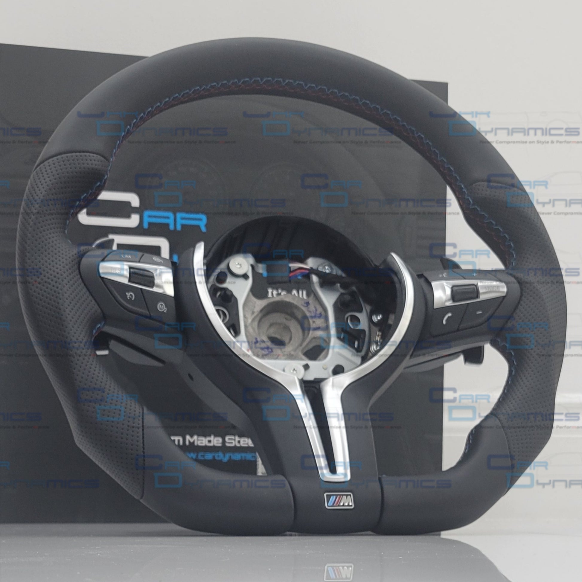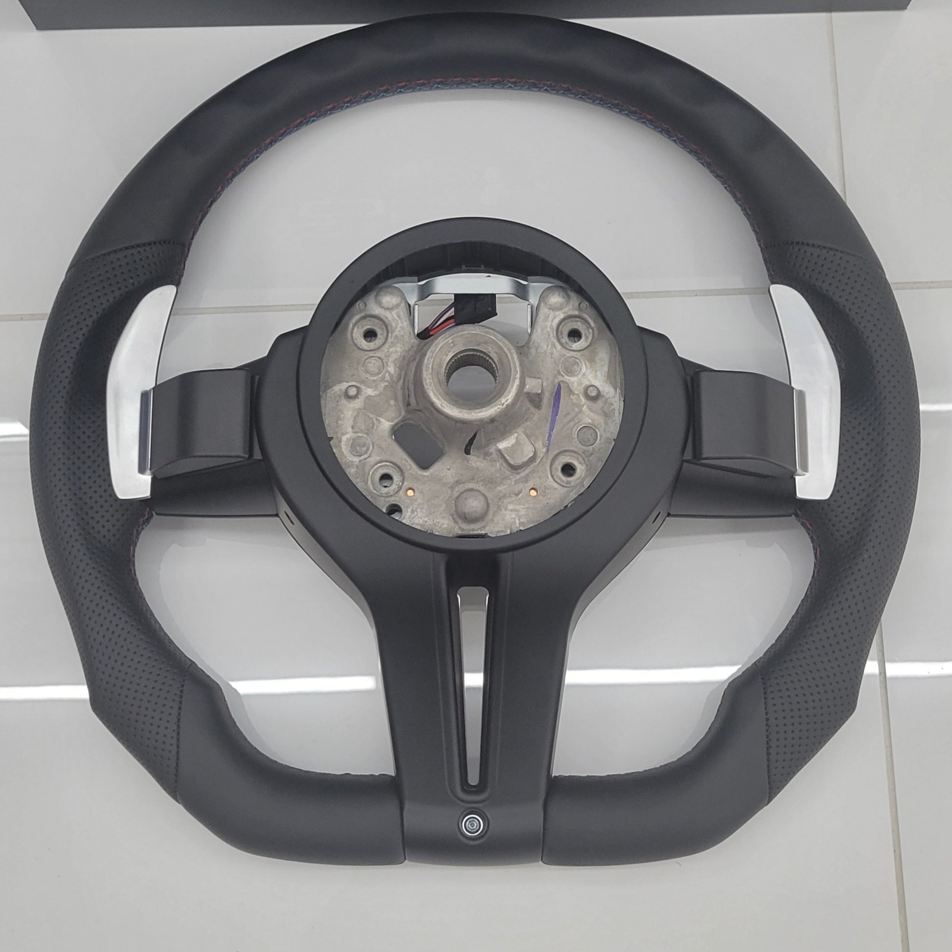 Premium Sports Steering Wheel UpgradeA sleek, performance-focused upgrade for your BMW F-Series, featuring polished metallic accents, tri-colour M-Tech stitching, and integrated paddle shifters.