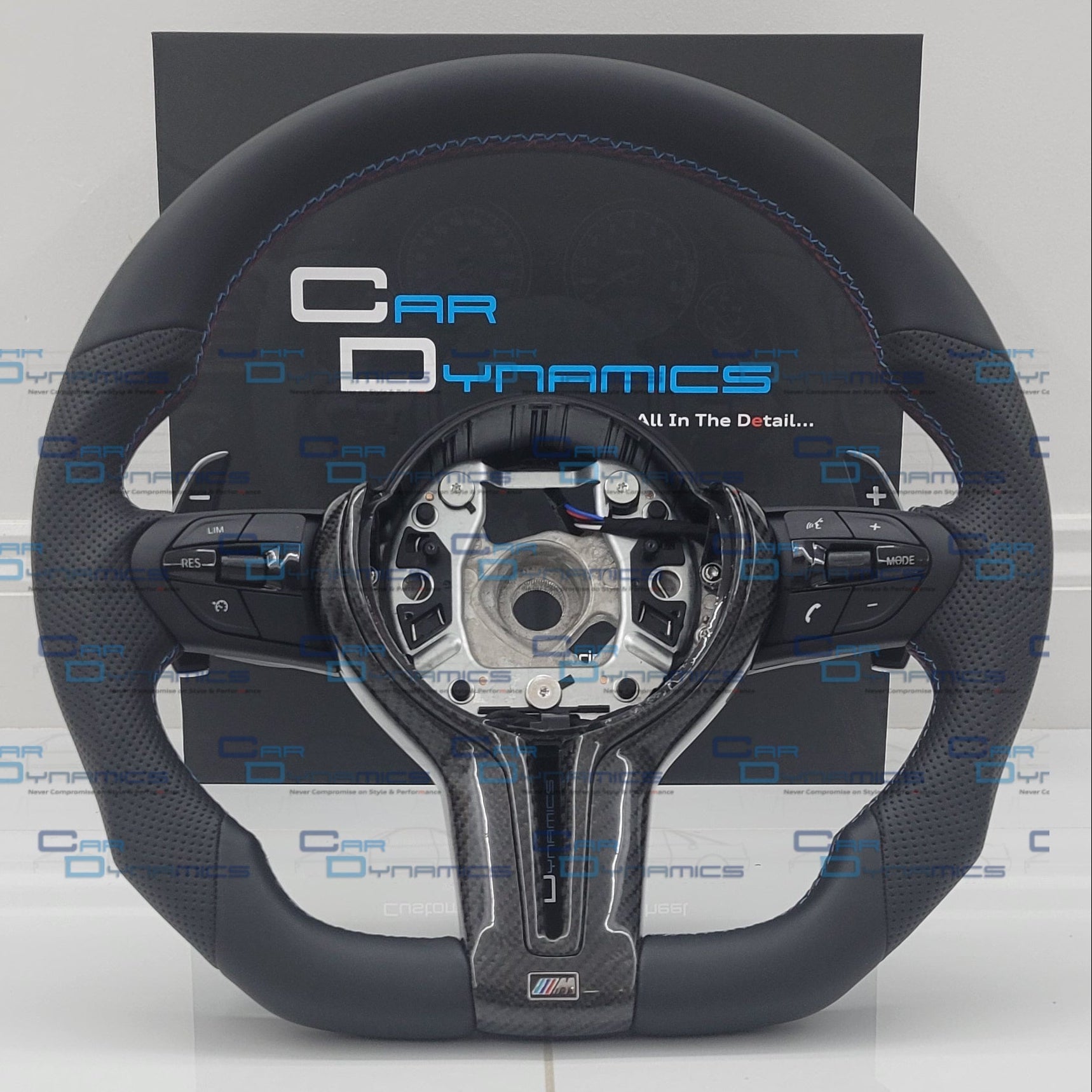 Premium Sports Steering Wheel UpgradeA sleek, performance-focused upgrade for your BMW F-Series, featuring gloss black & carbon fibre accents, tri-colour M-Tech stitching, and integrated paddle shifters.
