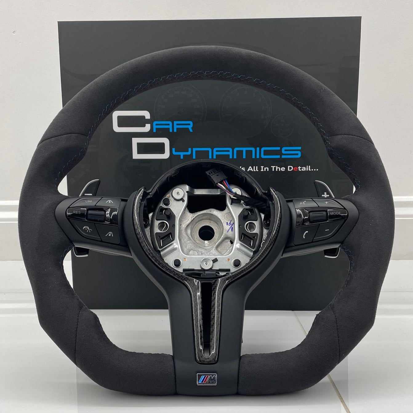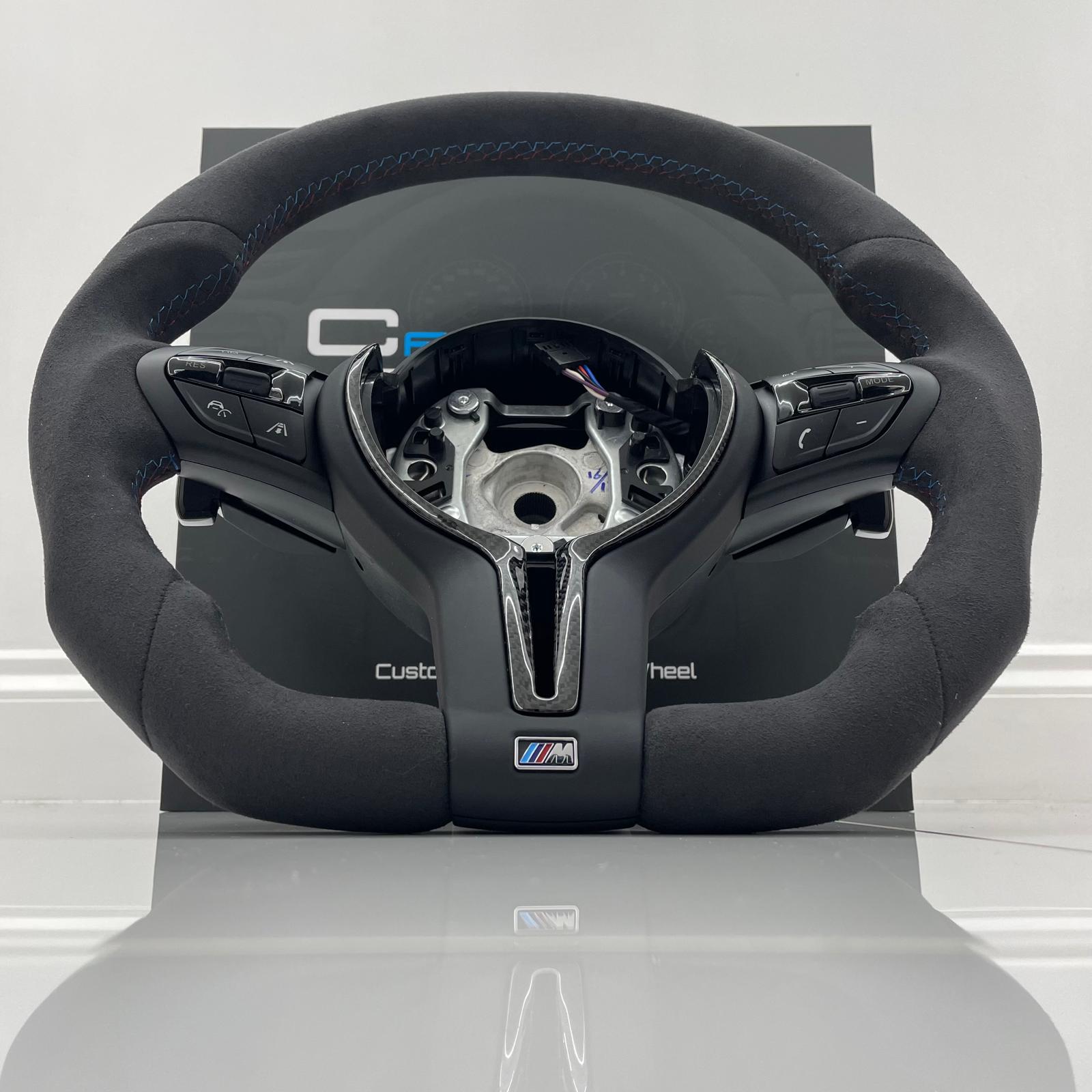 Premium Sports Steering Wheel UpgradeA sleek, performance-focused upgrade for your BMW F-Series, featuring gloss black accents ,matte carbon fibre, tri-colour M-Tech stitching, and integrated paddle shifters.