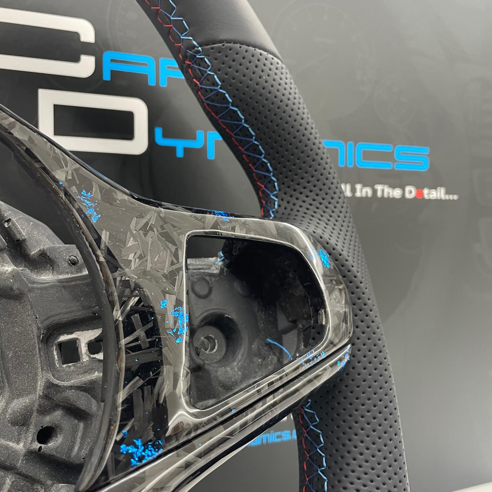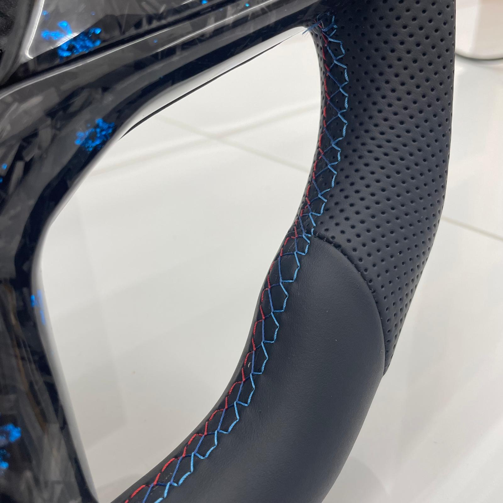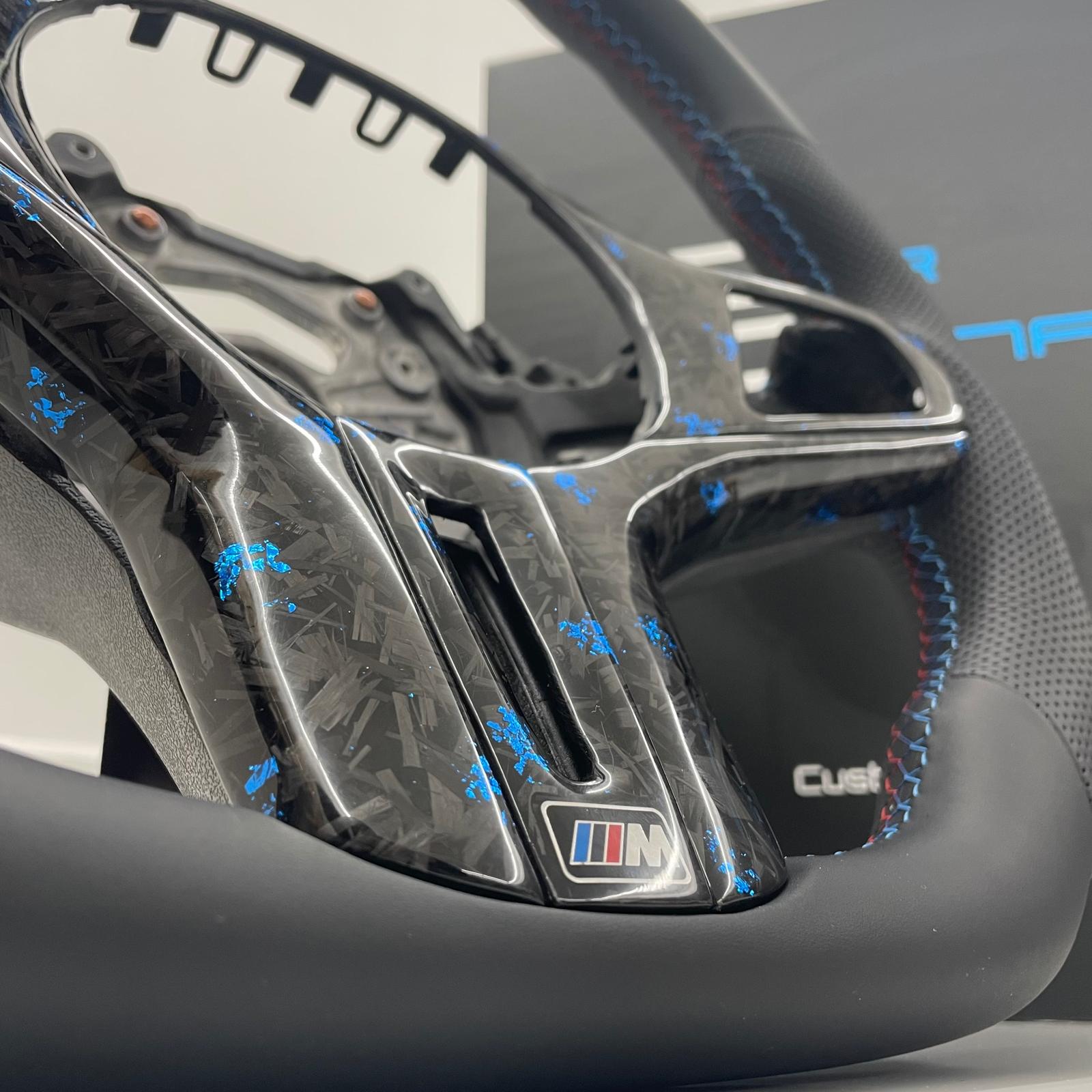 Premium Sports Steering Wheel UpgradeA sleek, performance-focused upgrade for your BMW F&G-Series, featuring tri-colour M-Tech stitching, blue forged carbon fibre trim and integrated black paddle shifters