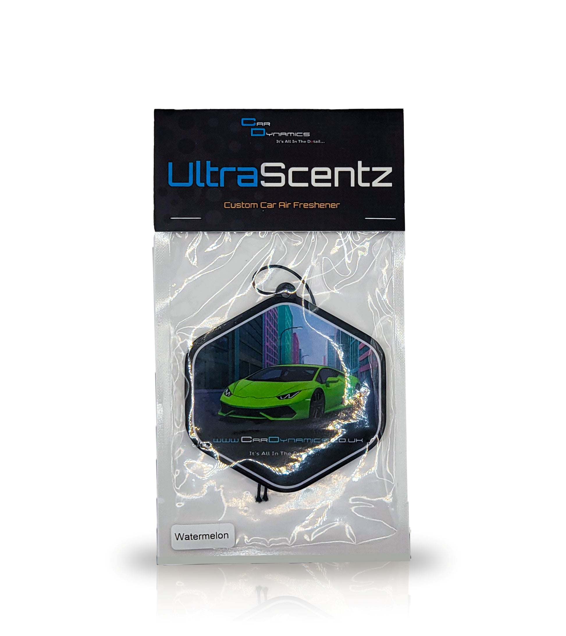 Bring supercar drama and summer energy to your cabin with Carl's Huracán UltraScentz Hanging Air Freshener, a tribute to exotic design, community pride and the mouth watering burst of Watermelon fragrance.